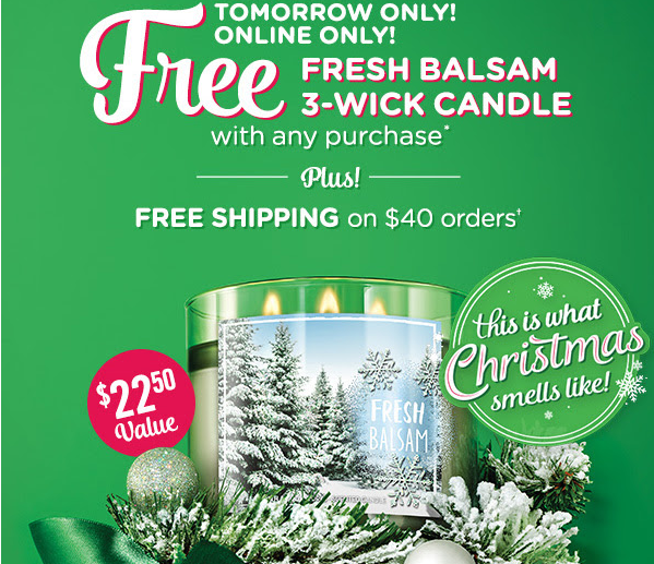 Today only (31 October 2016) you can get a FREE Fresh Balsam Candle from Bath and Body Works with any purchase. I got the email last night and included a snip of the promotion.