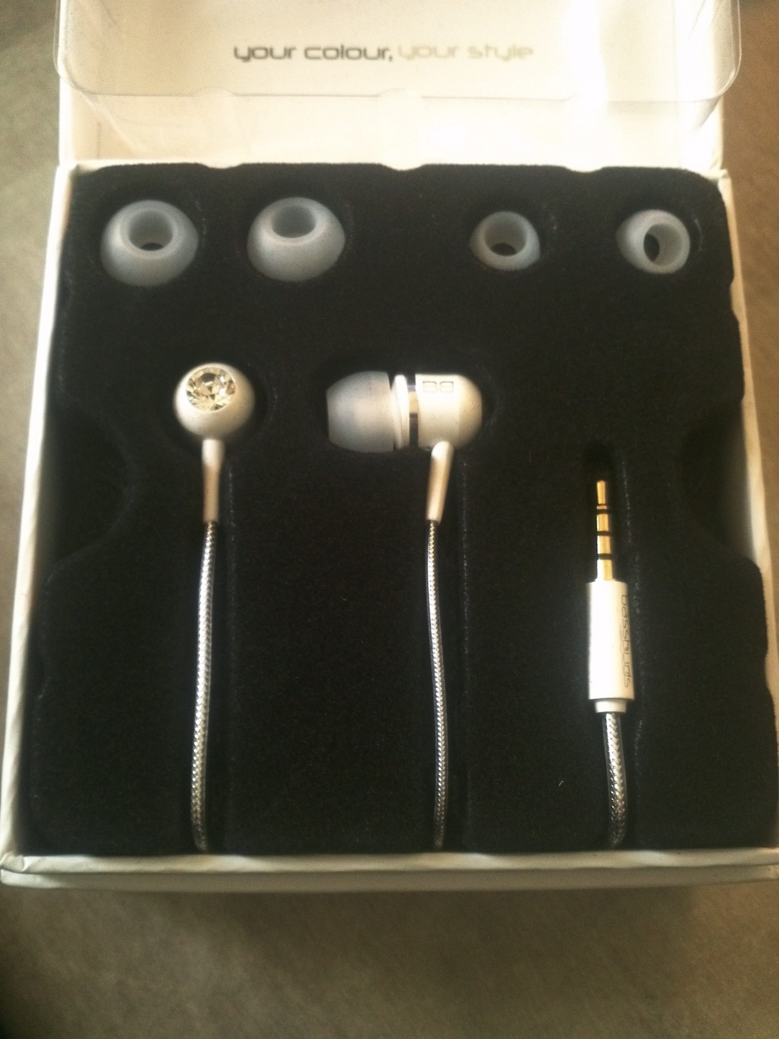 The ear buds came in a cute box and upon opening I saw the ear buds and three sets of rubber ear buds. I tried the medium sized buds which came already attached and they fit perfectly so I did not need to try to large or small sizes.