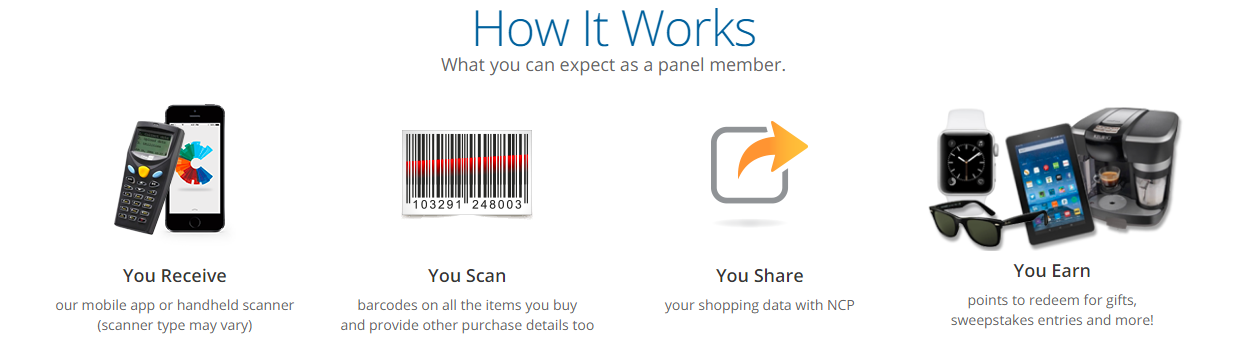 NCP is the National Consumer Panel which is a partner of Nielsen. They track consumer information and preferences over a wide variety of items. Basically you scan your purchases and transmit your purchase history to the company. They use that information to make a variety of decisions and award you points for transmitting.
