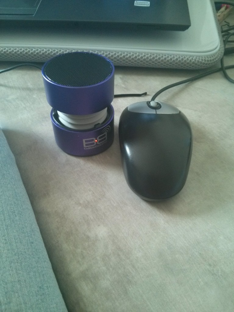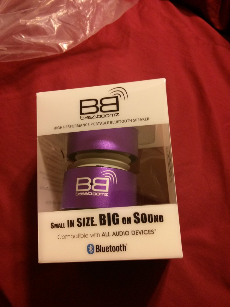 I got a set of the BassBoomz speakers to try out and immediately got excited when I saw they were in purple which is my second favorite color. The speakers come in a very compact shape and you can twist them apart to get a little distance between the two pieces. I thought that was very cool because it allowed for protection of the more delicate middle part and gives you a sturdy package for moving the speakers around.